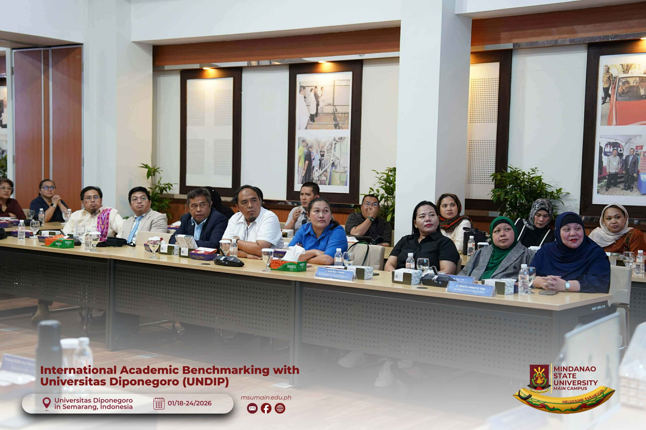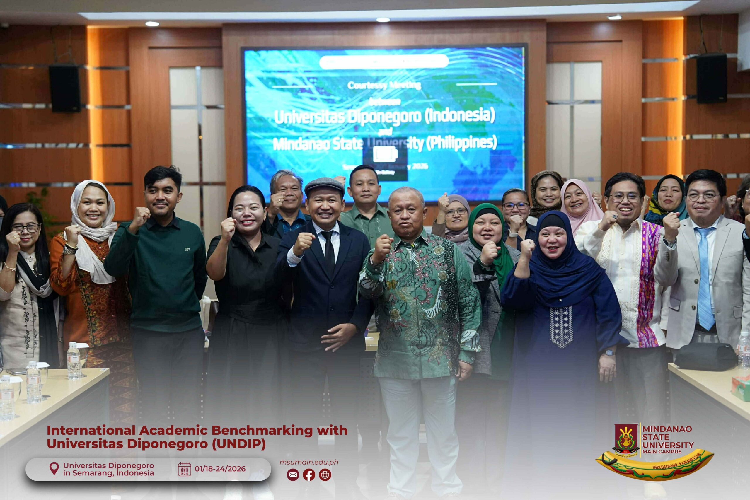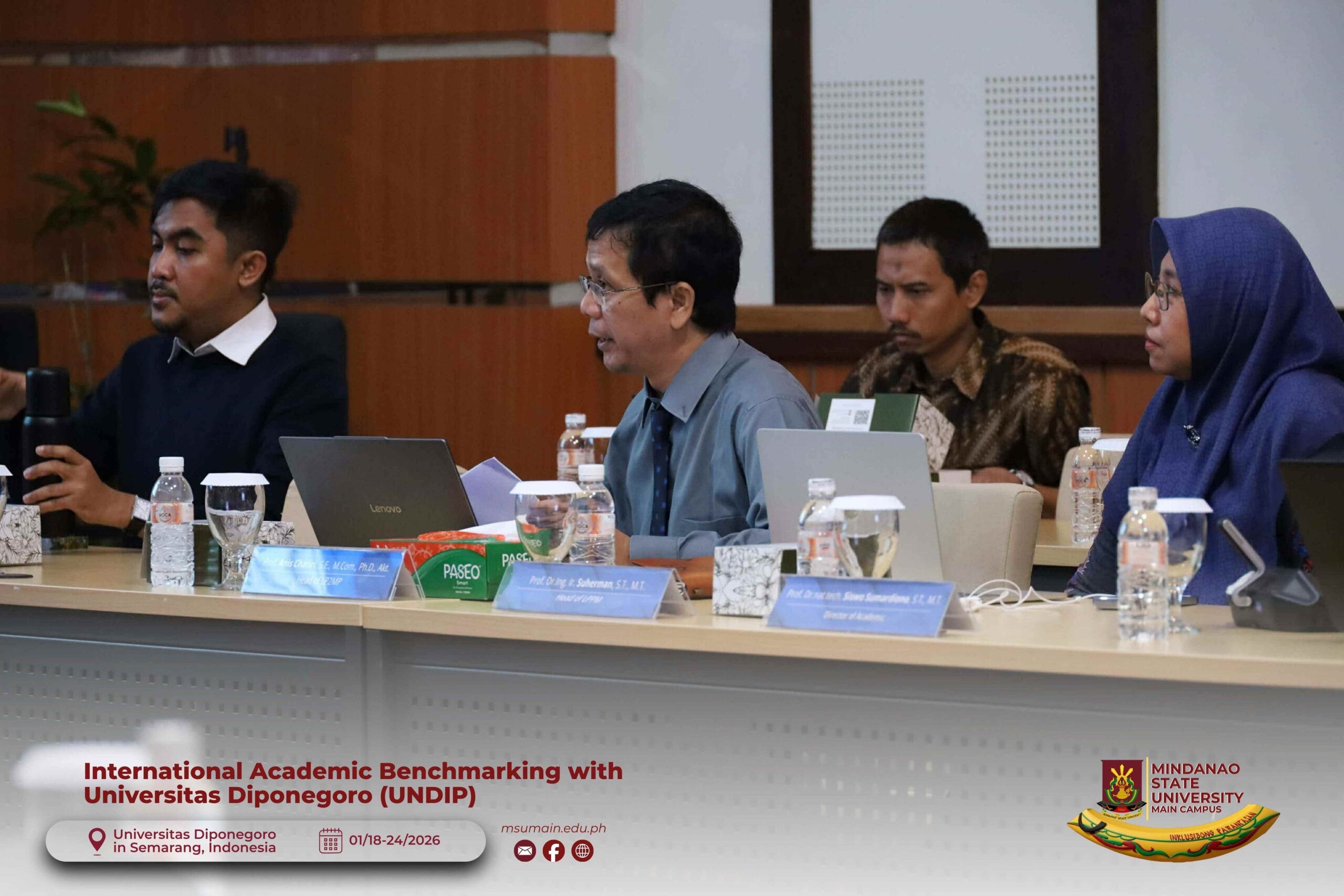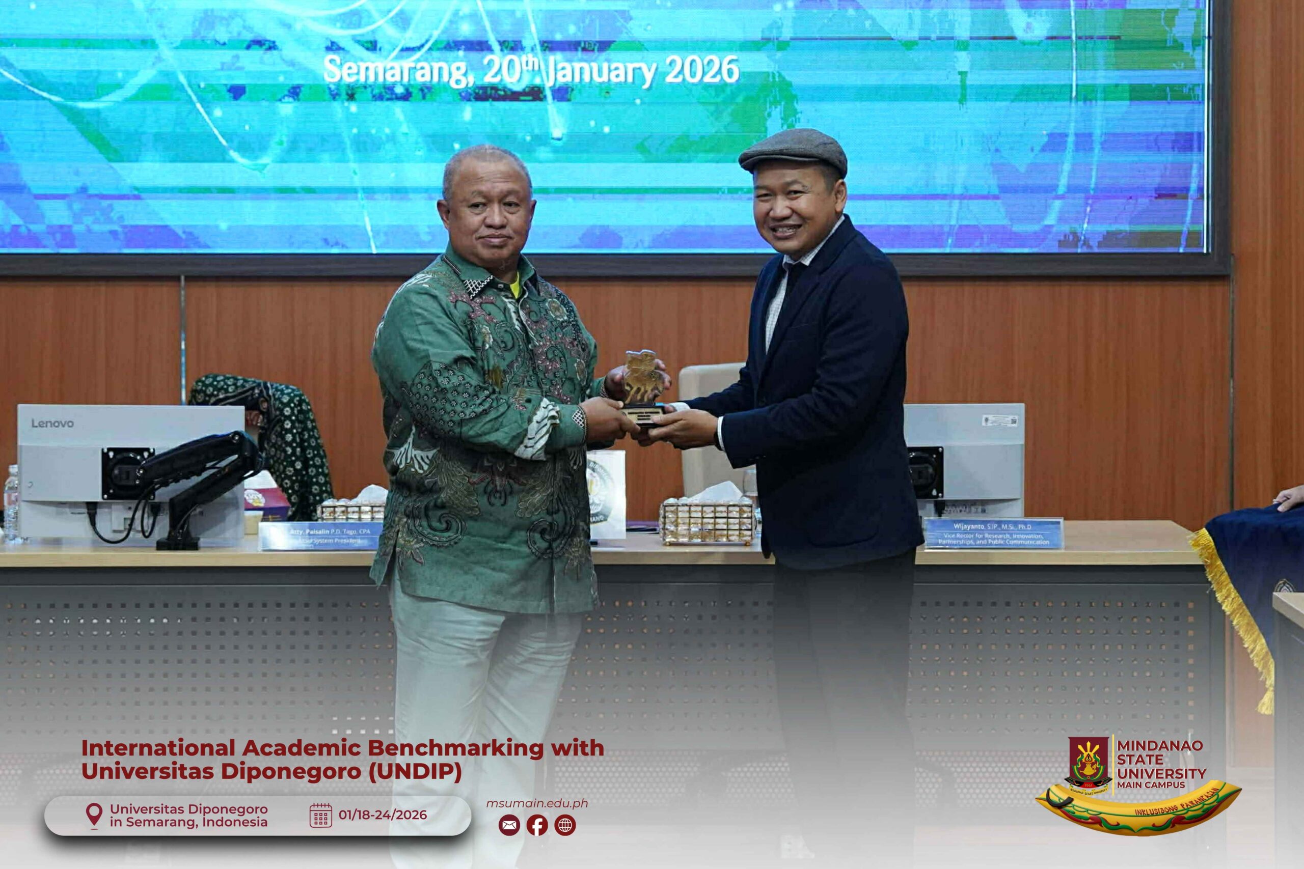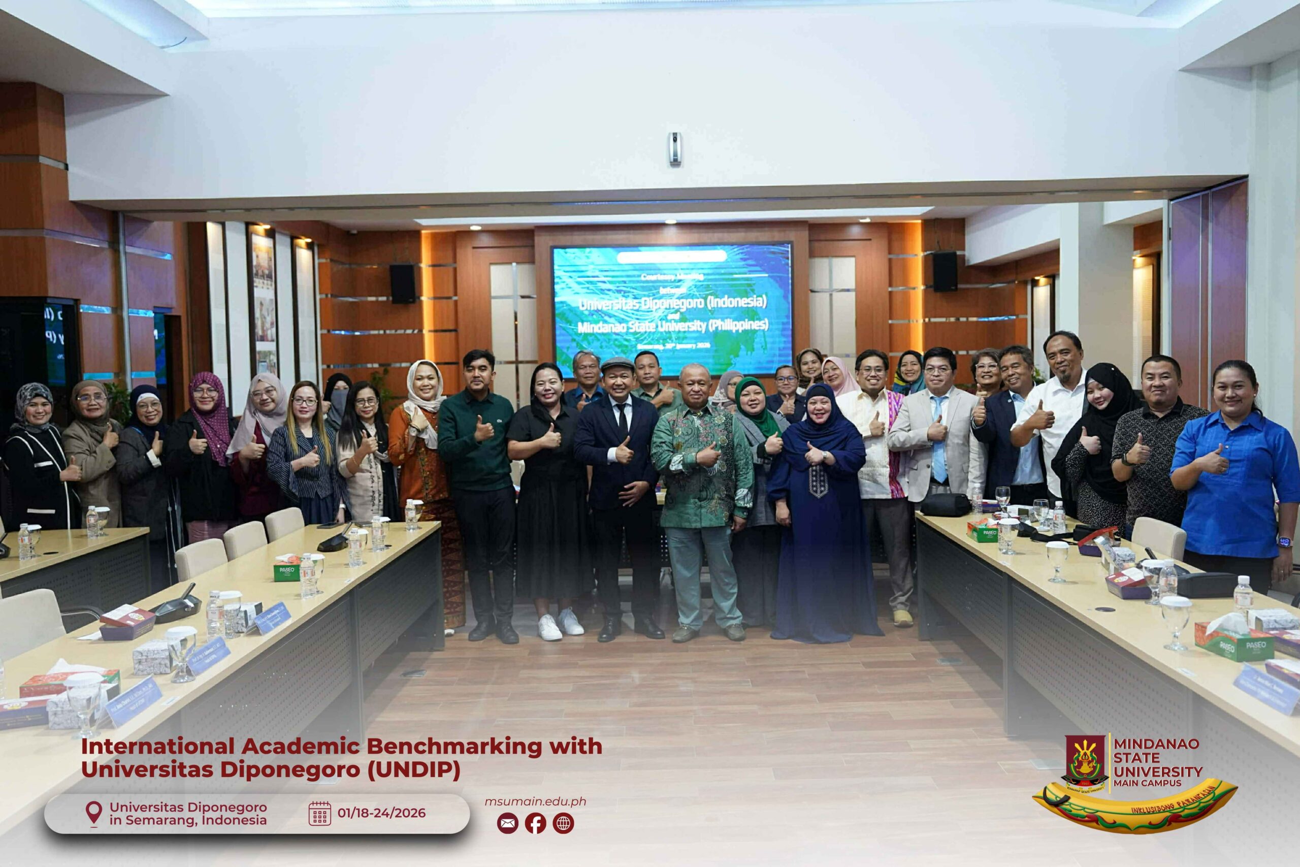 The Mindanao State University (MSU) Main Campus participated in the International Academic Benchmarking and International Engagement activity at Universitas Diponegoro (UNDIP) in Semarang, Indonesia, from January 18 to 24, 2026. The delegation was led by MSU System President, Atty. Paisalin P. D. Tago, CPA, and included the Vice President for Academic Affairs, Dr. Minerva-Saminah M. Naga; the Vice Chancellor for Research, Extension and Development, Dr. Annie Mae C. Berowa; the Vice Chancellor for Planning and Development, Dr. Oding L. Maamor; and the Deans of various colleges of MSU Main Campus.
