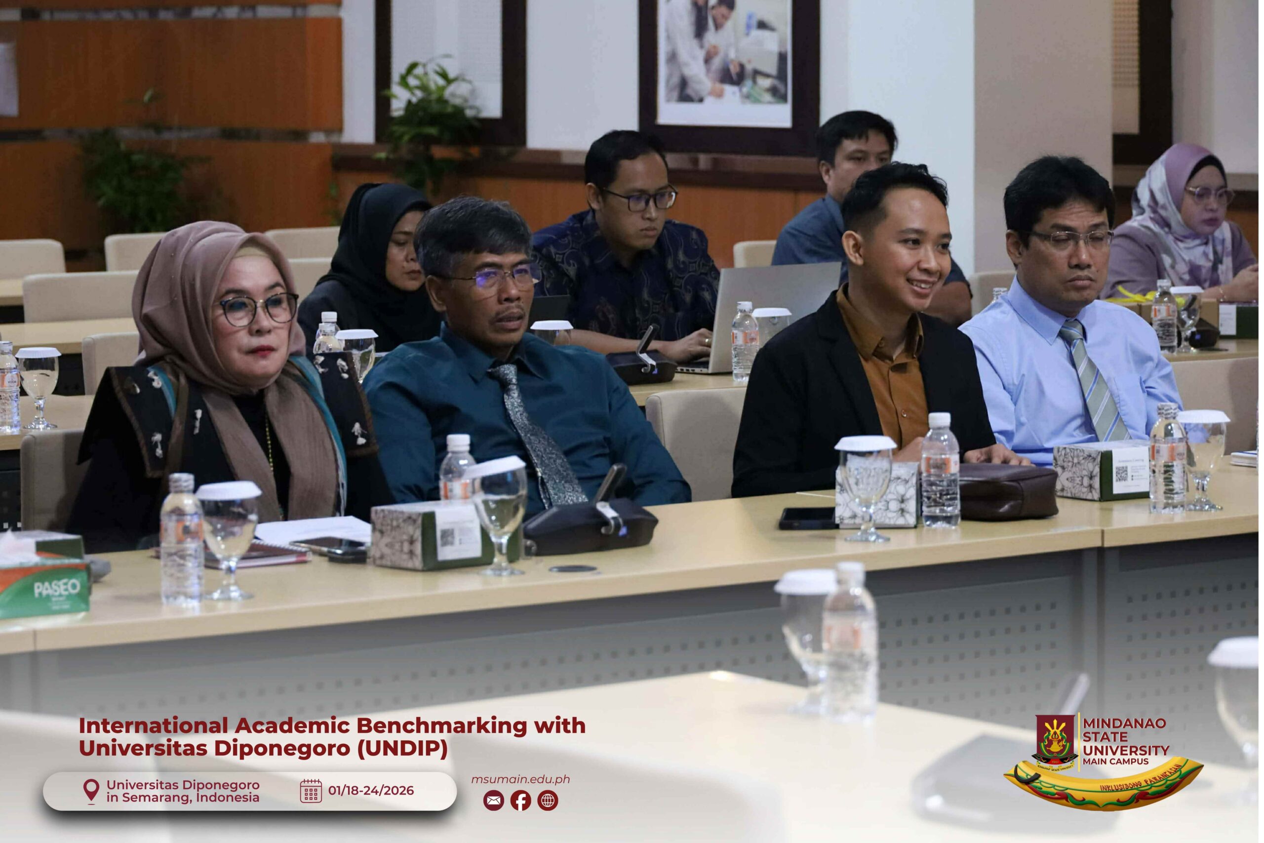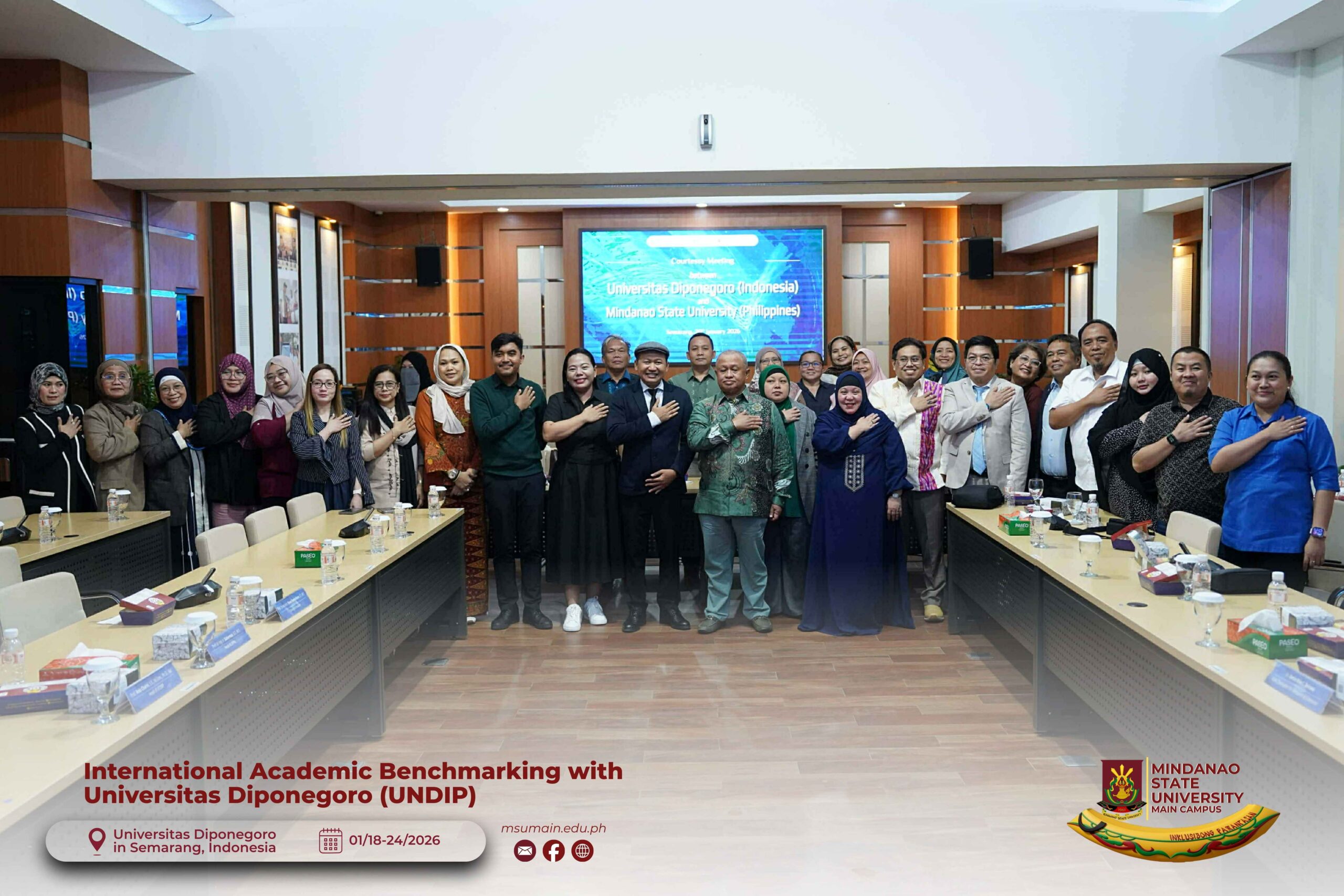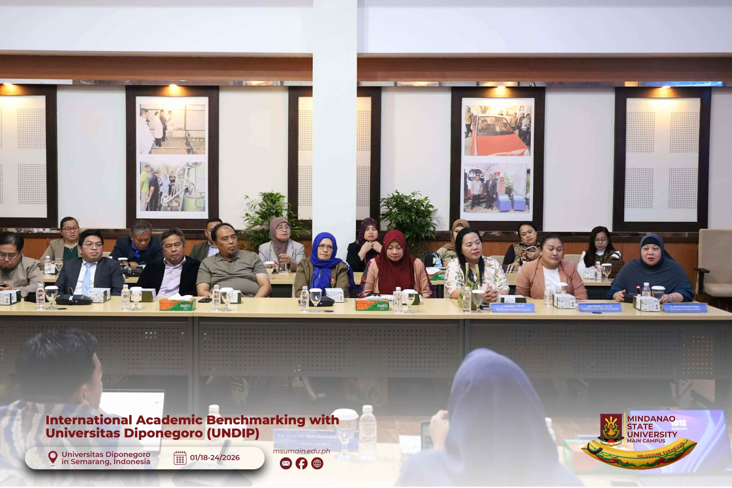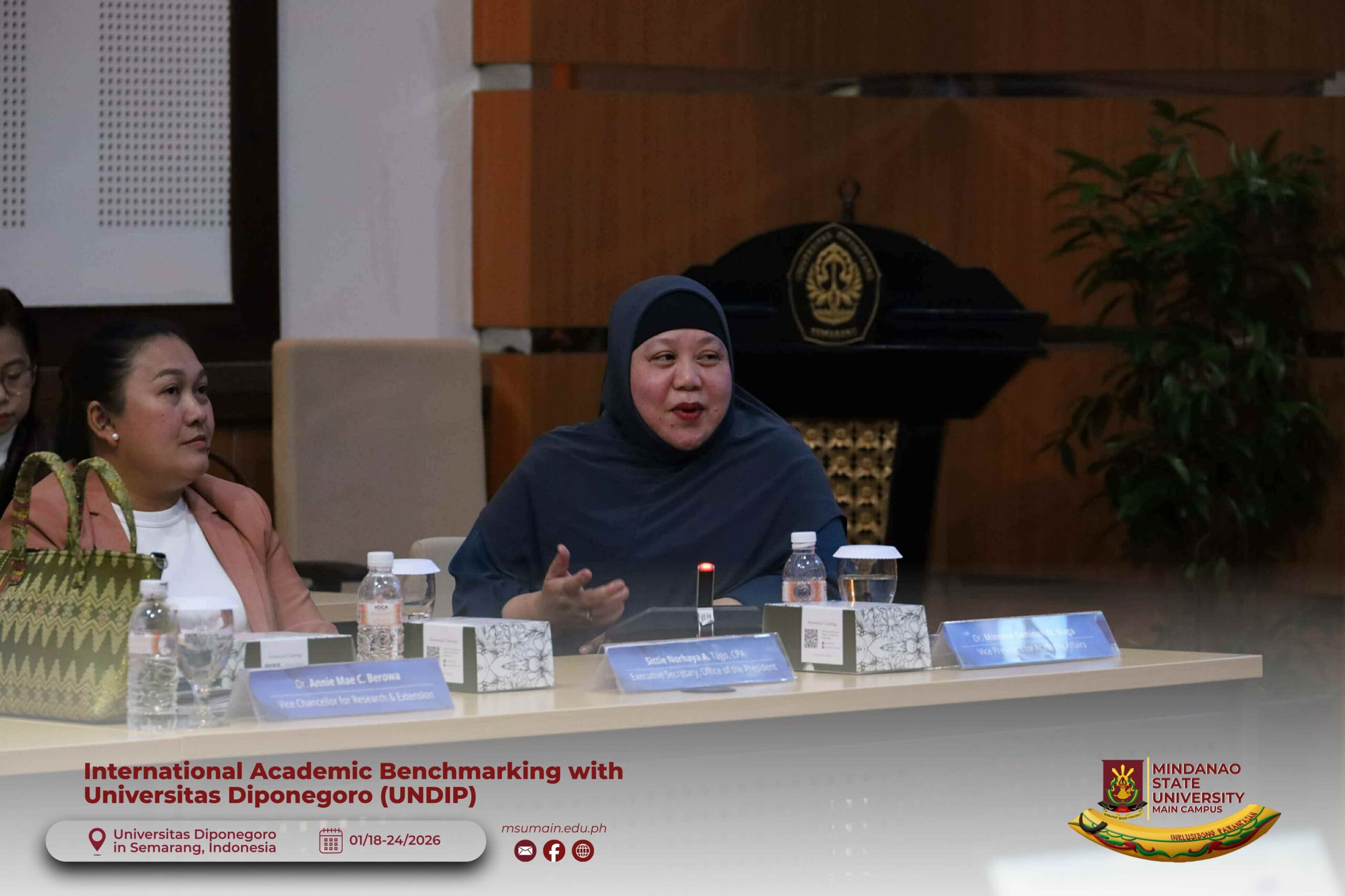 The Mindanao State University (MSU) Main Campus participated in the International Academic Benchmarking and International Engagement activity at Universitas Diponegoro (UNDIP) in Semarang, Indonesia, from January 18 to 24, 2026. The delegation was led by MSU System President, Atty. Paisalin P. D. Tago, CPA, and included the Vice President for Academic Affairs, Dr. Minerva-Saminah M. Naga; the Vice Chancellor for Research, Extension and Development, Dr. Annie Mae C. Berowa; the Vice Chancellor for Planning and Development, Dr. Oding L. Maamor; and the Deans of various colleges of MSU Main Campus.
