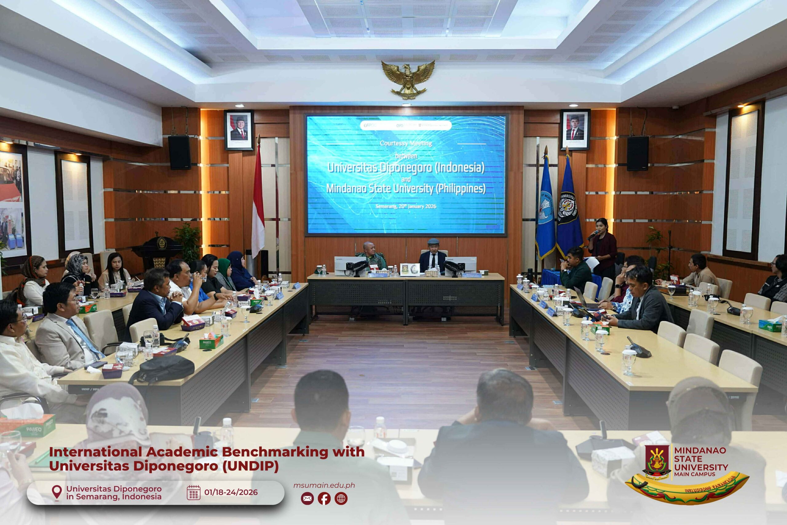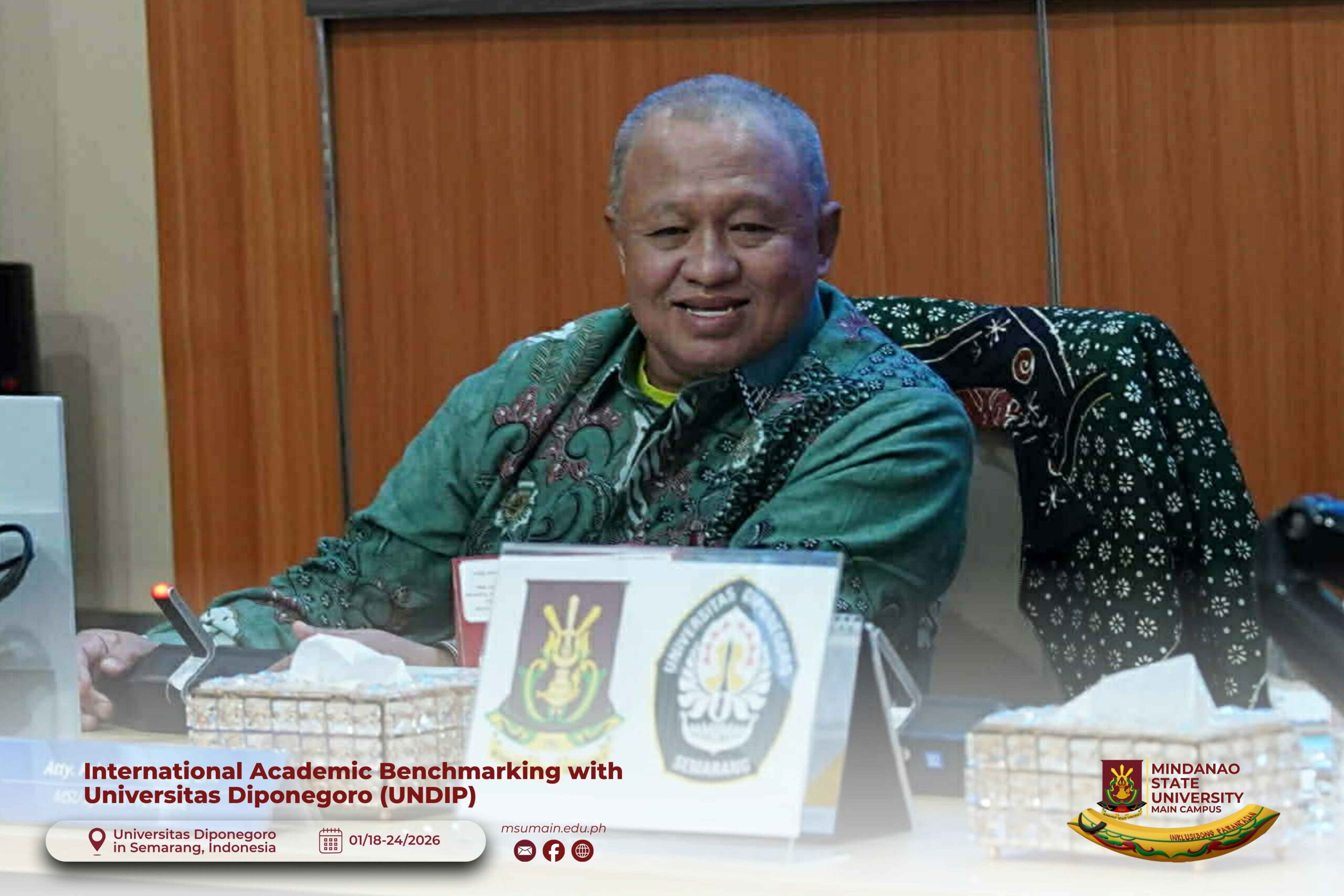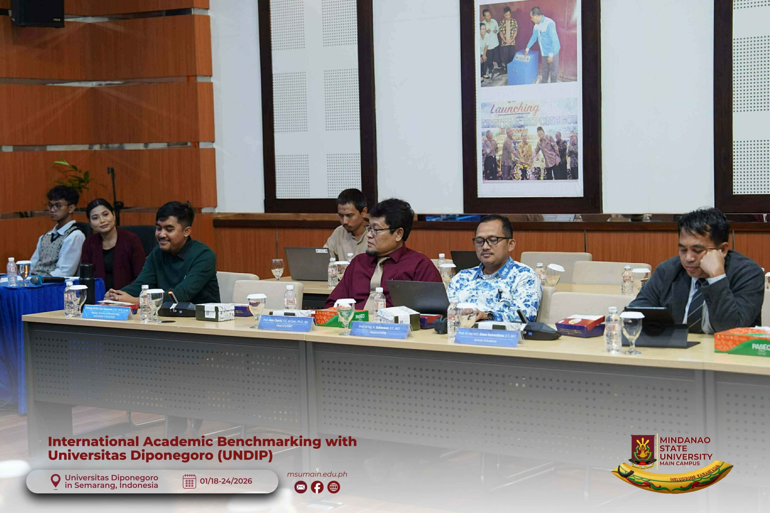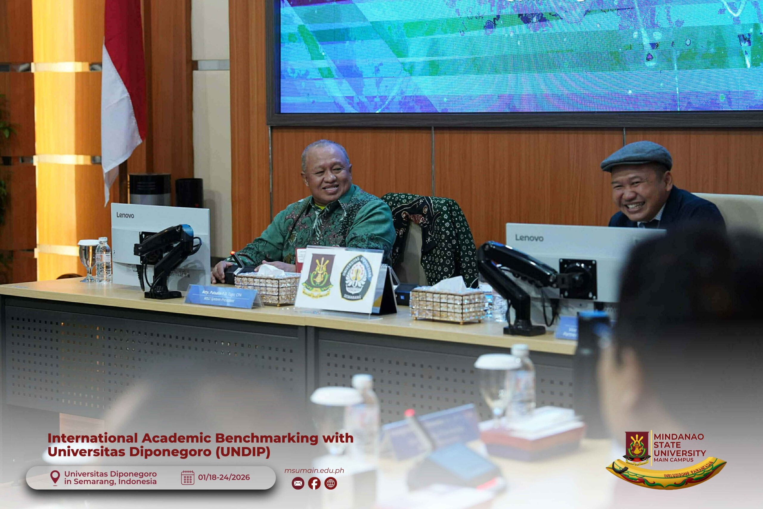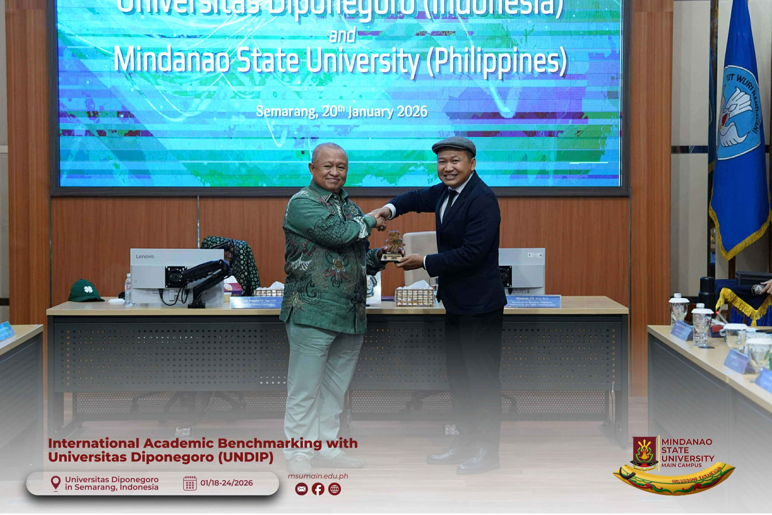 The Mindanao State University (MSU) Main Campus participated in the International Academic Benchmarking and International Engagement activity at Universitas Diponegoro (UNDIP) in Semarang, Indonesia, from January 18 to 24, 2026. The delegation was led by MSU System President, Atty. Paisalin P. D. Tago, CPA, and included the Vice President for Academic Affairs, Dr. Minerva-Saminah M. Naga; the Vice Chancellor for Research, Extension and Development, Dr. Annie Mae C. Berowa; the Vice Chancellor for Planning and Development, Dr. Oding L. Maamor; and the Deans of various colleges of MSU Main Campus.