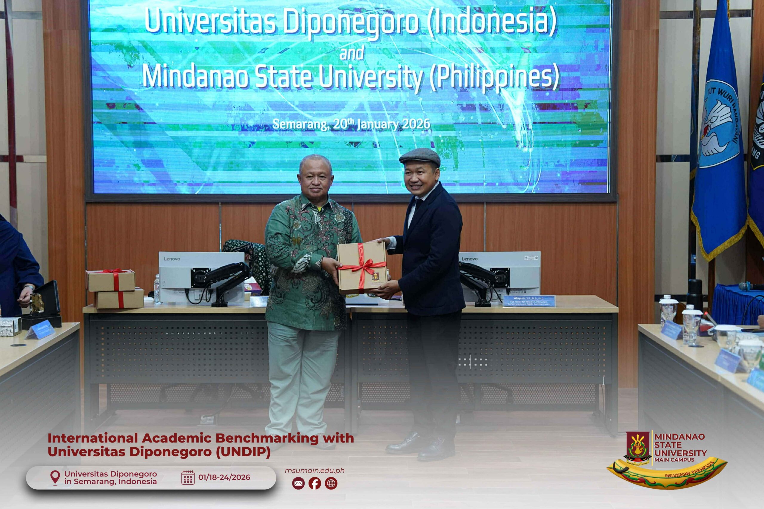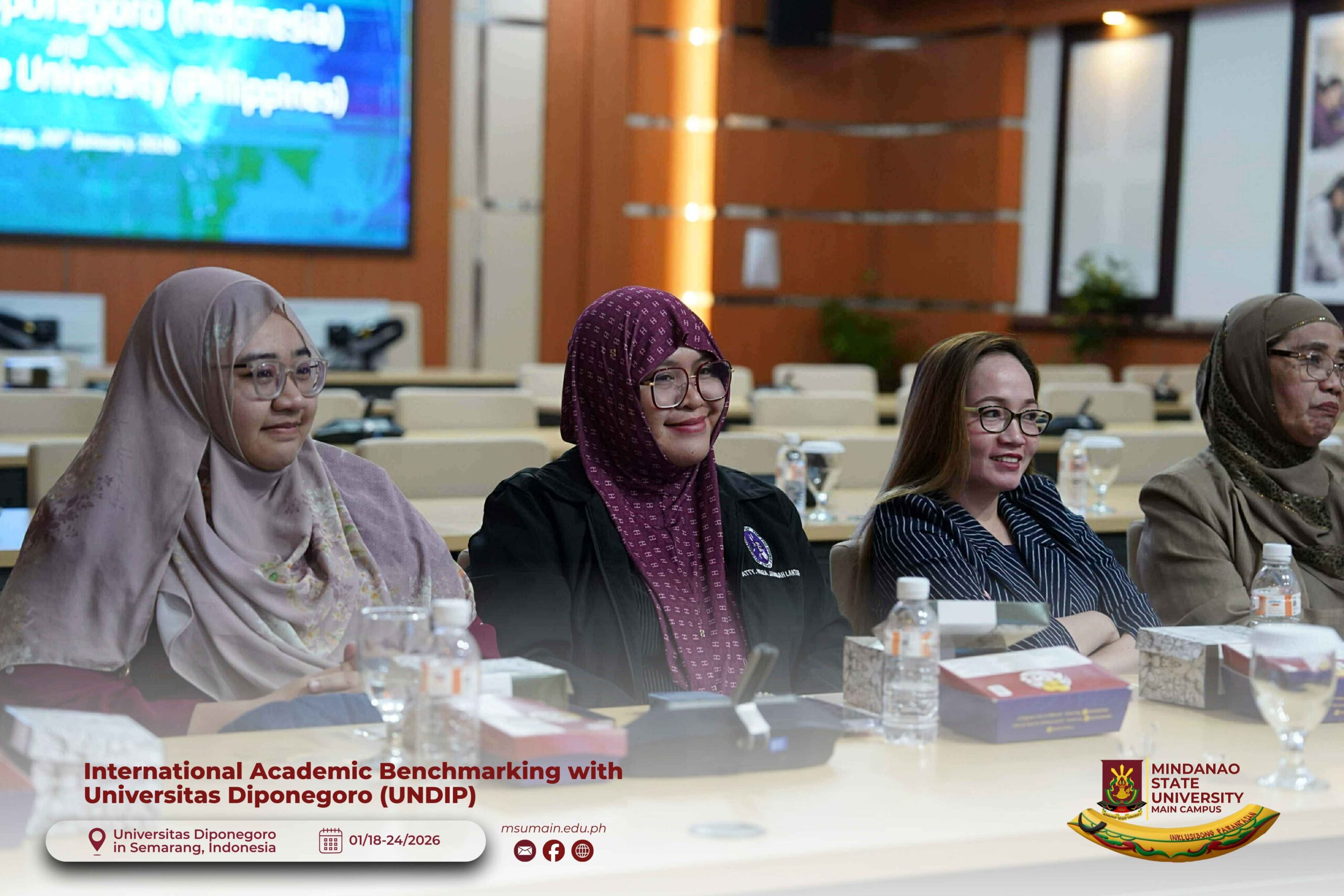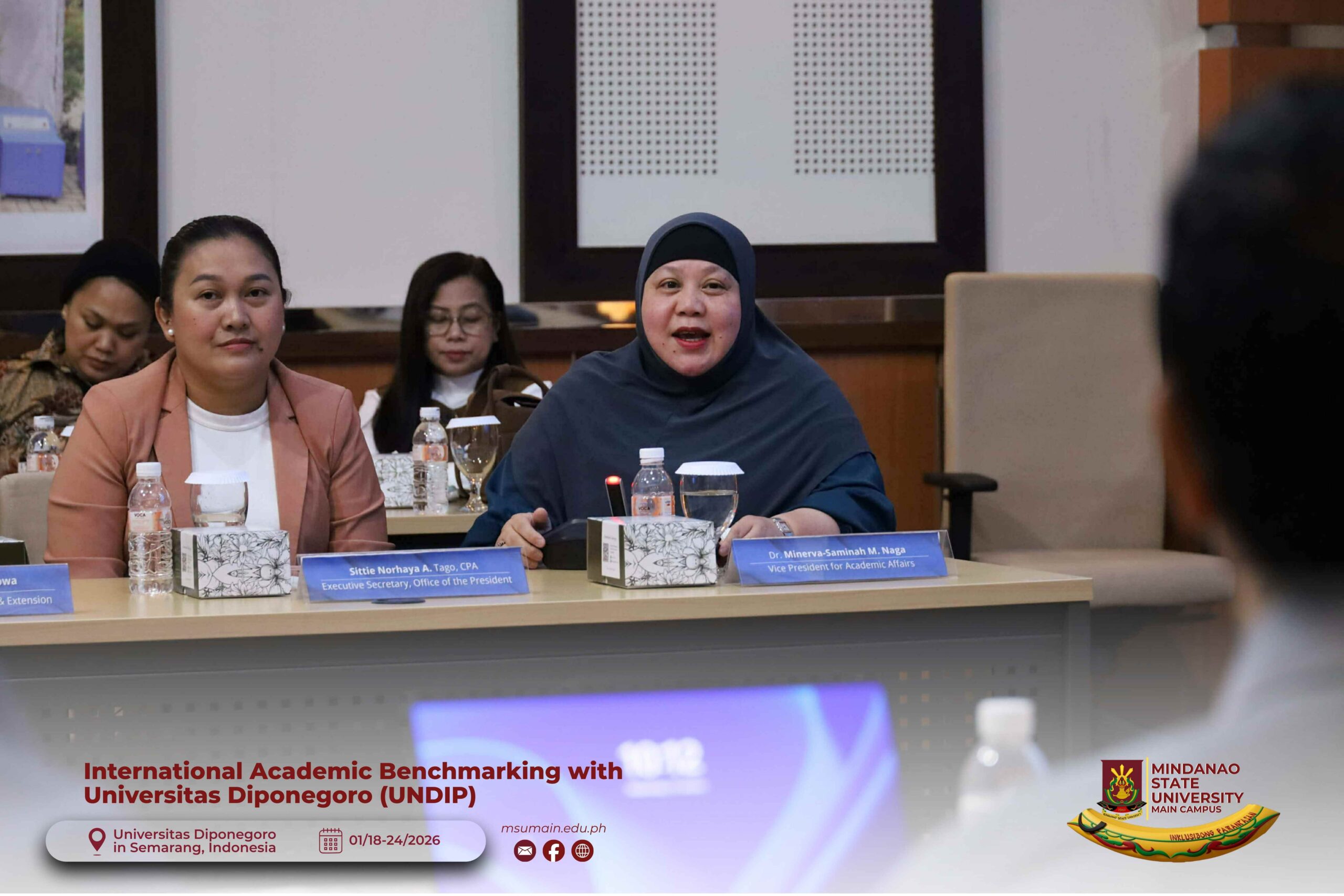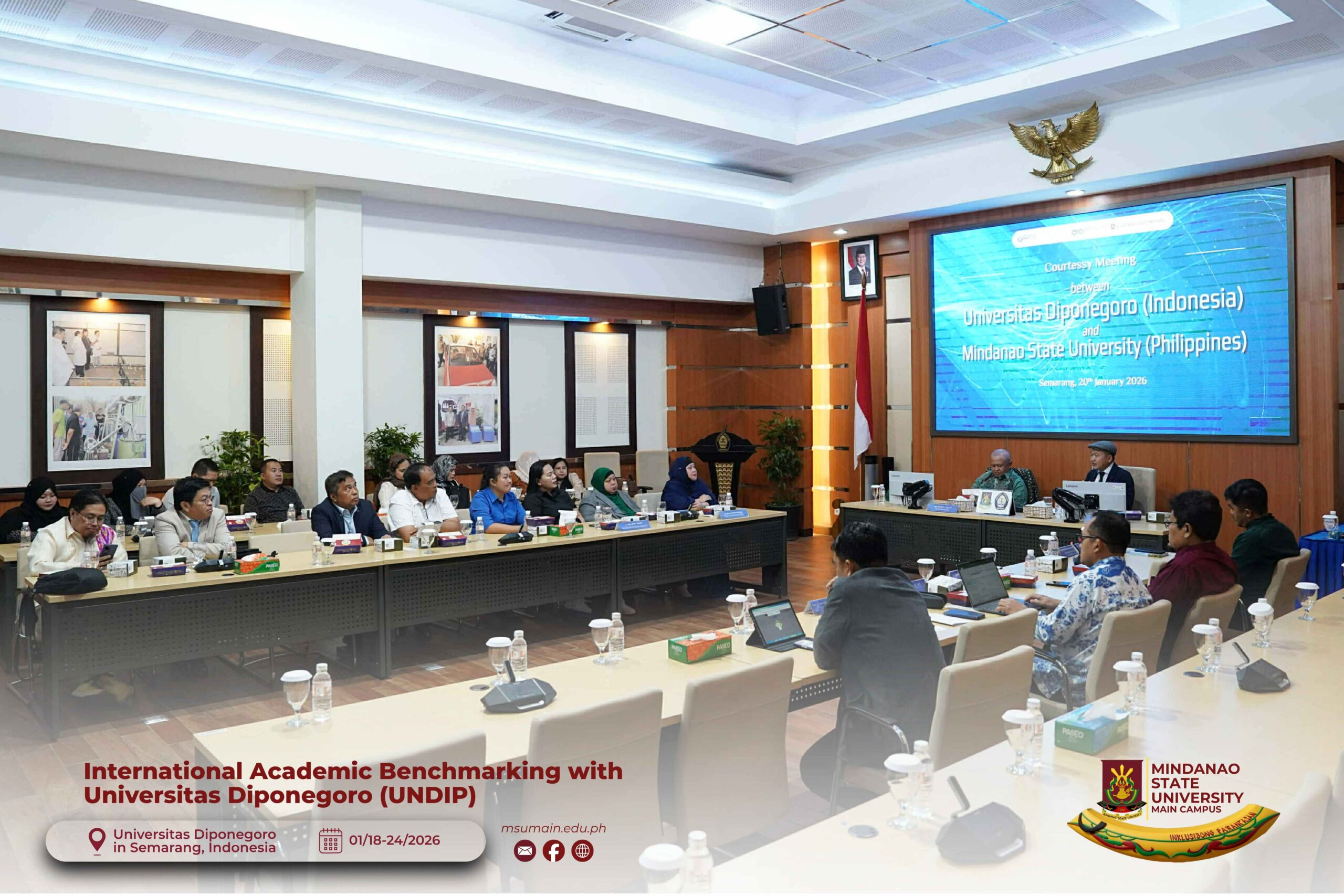 The Mindanao State University (MSU) Main Campus participated in the International Academic Benchmarking and International Engagement activity at Universitas Diponegoro (UNDIP) in Semarang, Indonesia, from January 18 to 24, 2026. The delegation was led by MSU System President, Atty. Paisalin P. D. Tago, CPA, and included the Vice President for Academic Affairs, Dr. Minerva-Saminah M. Naga; the Vice Chancellor for Research, Extension and Development, Dr. Annie Mae C. Berowa; the Vice Chancellor for Planning and Development, Dr. Oding L. Maamor; and the Deans of various colleges of MSU Main Campus.